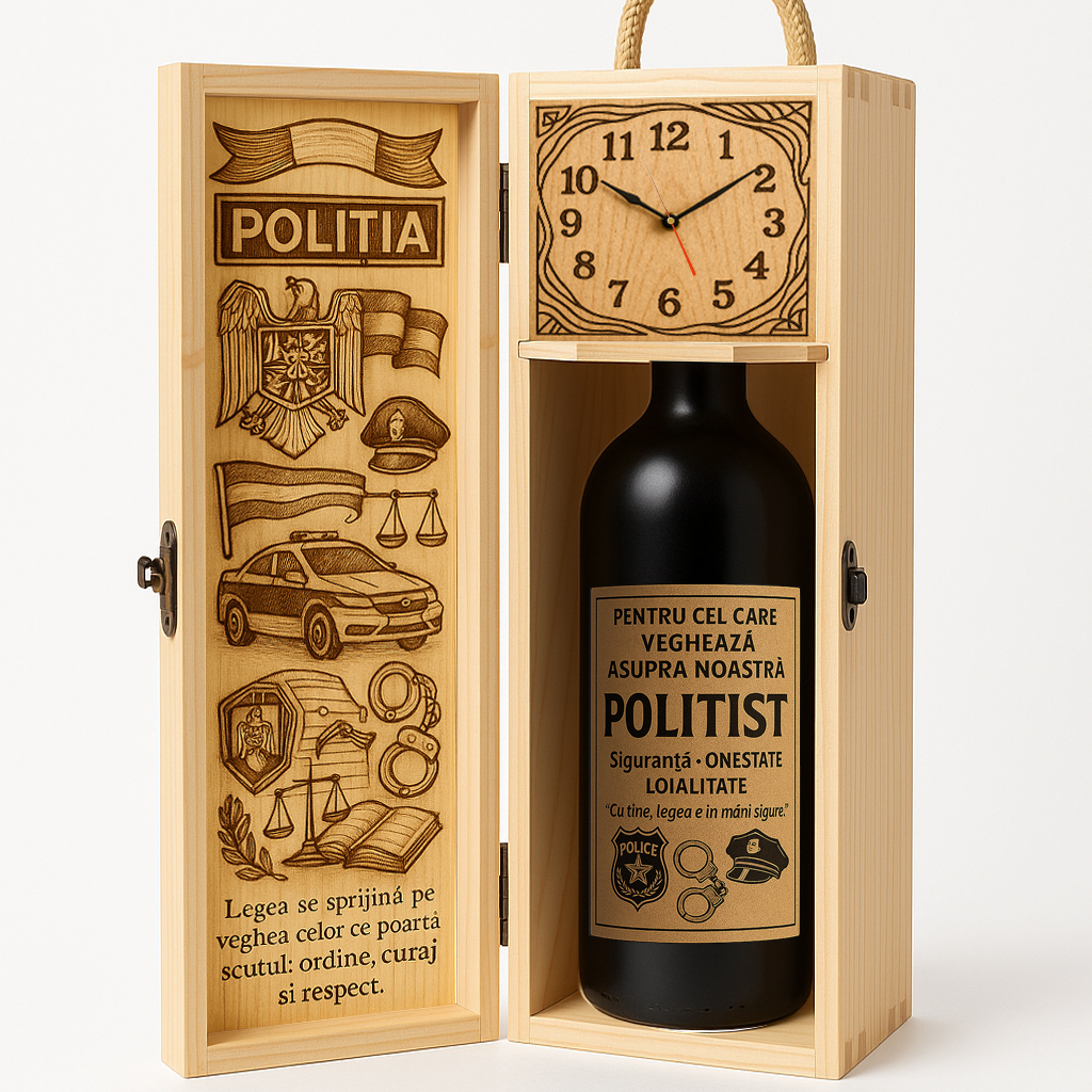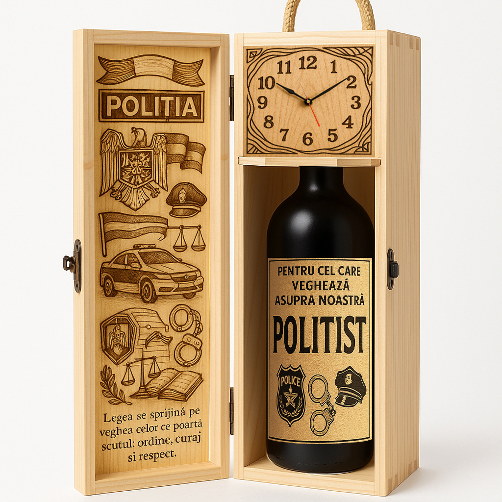 Un cadou elegant, care exprimă respectul și recunoștința pentru curajul, disciplina și devotamentul unui adevărat polițist. Cutia din lemn de pin, prevăzută cu mâner din sfoară și închidere metalică, impresionează prin eleganța sobră și prezentarea de lux – potrivită pentru un apărător al legii care își exercită profesia cu onoare și demnitate.