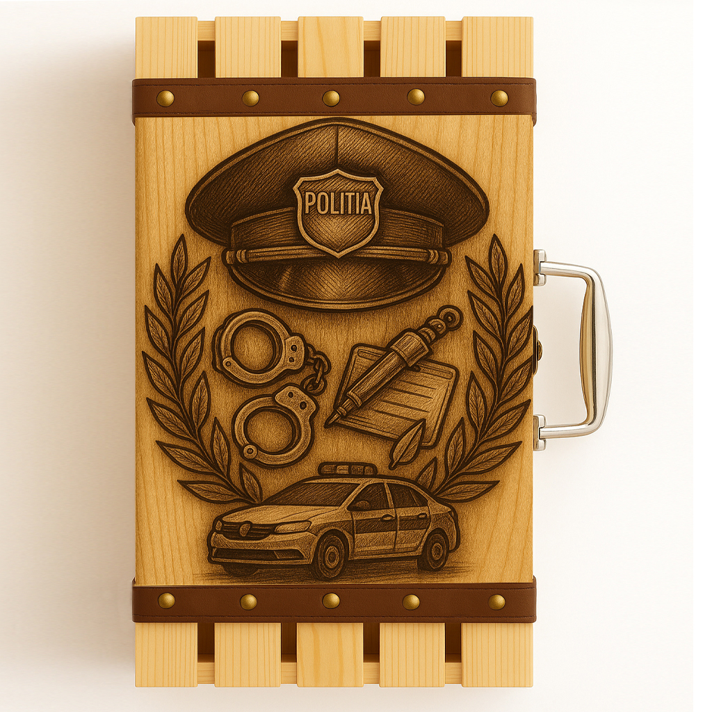 Un cadou elegant și demn, dedicat unei profesii care inspiră disciplină, curaj și respect. Cutia din lemn de pin tip cufăr, cu inserții din piele și închidere metalică, se remarcă prin finisaje impecabile și o prezentare de lux, potrivită pentru un polițist care își poartă uniforma cu mândrie.