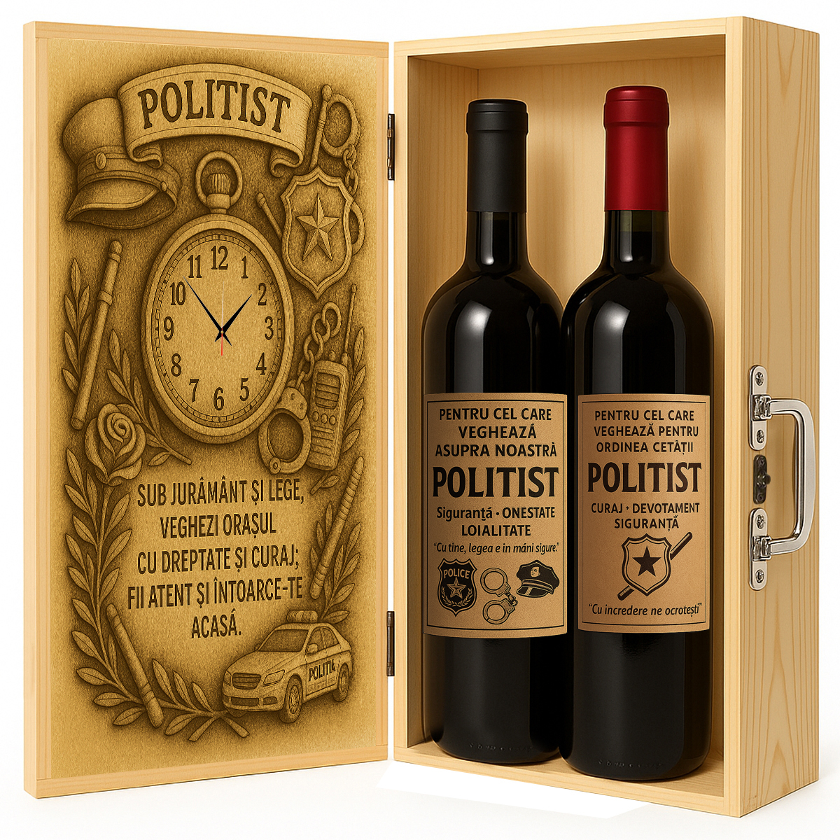 Interiorul, conceput cu atenție la detalii, include un ceas funcțional, simbol al vigilenței, al timpului petrecut în slujba ordinii și al dedicării față de datorie. Setul conține două sticle de vin a 750 ml, fiecare cu etichetă personalizată, iar textele din interior pot fi adaptate pentru a transmite un mesaj de apreciere, recunoștință sau felicitare.