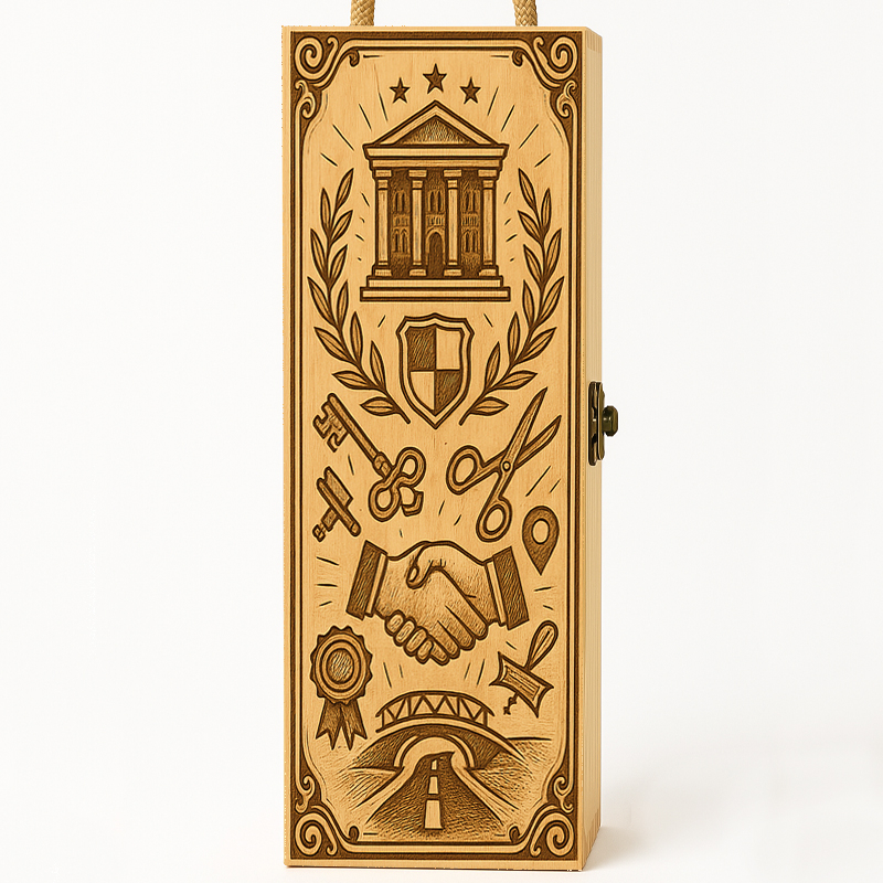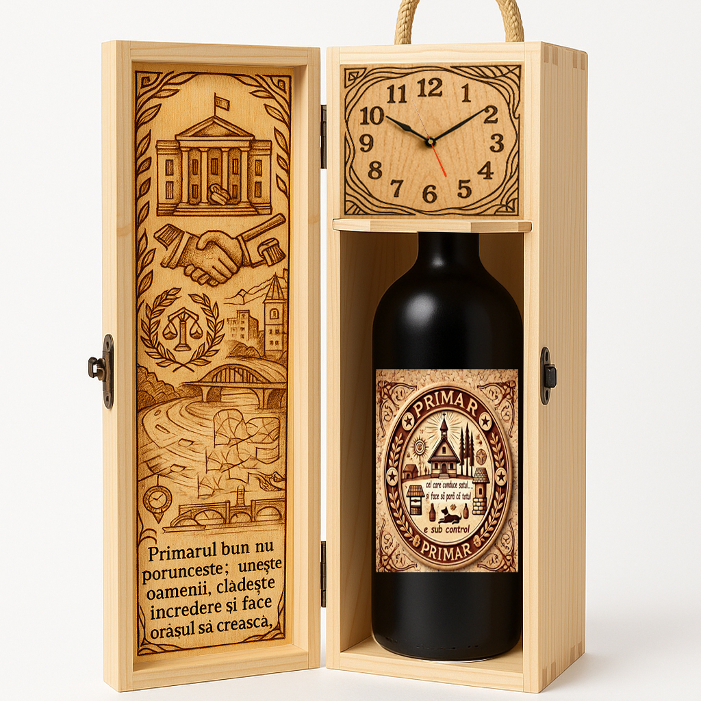 Un cadou elegant, care exprimă respectul, recunoștința și admirația pentru devotamentul și responsabilitatea unui adevărat primar. Cutia din lemn de pin, prevăzută cu mâner din sfoară și închidere metalică, se remarcă prin designul sobru și rafinat – o prezentare de lux potrivită pentru un lider dedicat comunității.