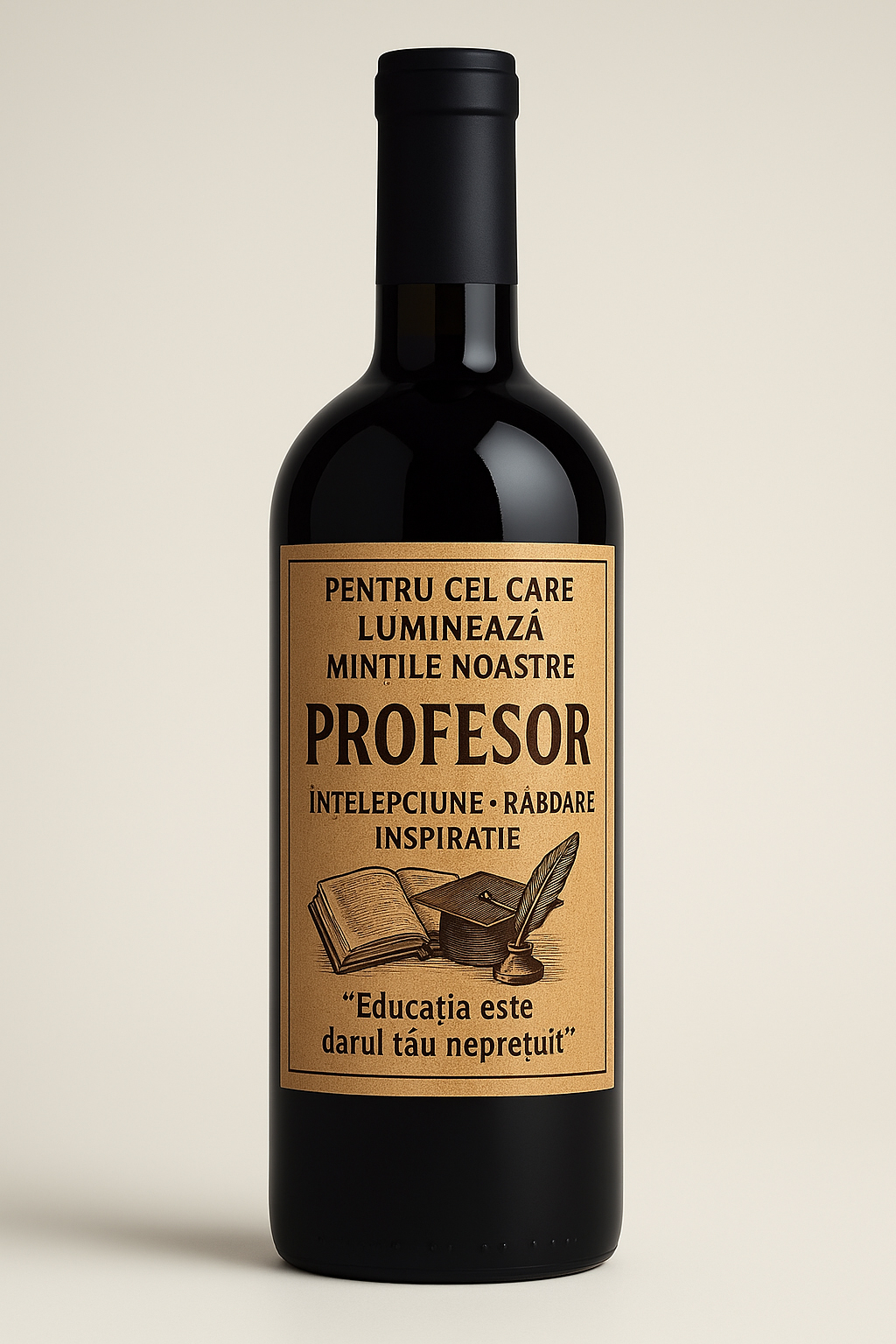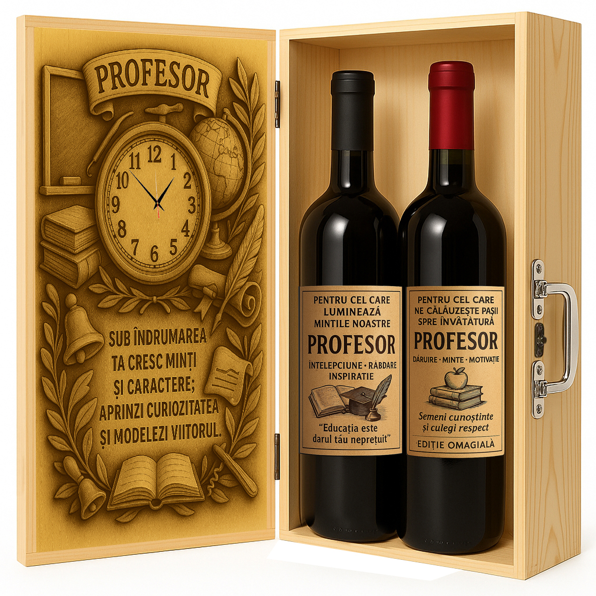 Interiorul, realizat cu atenție la detalii, include un ceas funcțional, simbol al timpului dăruit educației și al răbdării cu care se construiesc destine. Setul conține două sticle de vin a 750 ml, fiecare cu etichetă personalizată, iar textele din interior pot fi adaptate pentru un mesaj de recunoștință, admirație și respect.