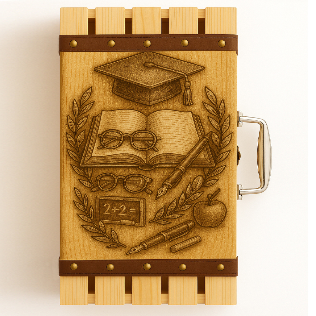 Un cadou rafinat, creat pentru a exprima aprecierea față de un profesor care a inspirat, a format și a dedicat timp generațiilor de elevi. Cutia din lemn de pin tip cufăr, cu inserții din piele și închidere metalică, impresionează prin designul echilibrat și o prezentare de lux, potrivită pentru un dascăl cu gust desăvârșit.