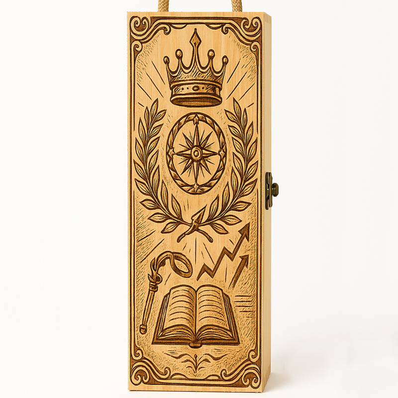 Un cadou elegant și rafinat, potrivit pentru a exprima respectul și aprecierea față de un lider care inspiră și coordonează cu înțelepciune. Cutia din lemn de pin, prevăzută cu mâner din sfoară și închidere metalică, se remarcă prin designul sobru și o prezentare de lux, ideală pentru mediul profesional.