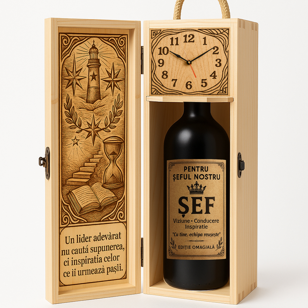 Interiorul, realizat cu grijă și atenție la detalii, include un ceas funcțional, simbol al echilibrului, al timpului dedicat conducerii și al deciziilor bine cântărite. Setul conține o sticlă de vin roșu de 750 ml, cu etichetă personalizată, iar textele din interior pot fi adaptate pentru un mesaj elegant de recunoștință sau felicitare.