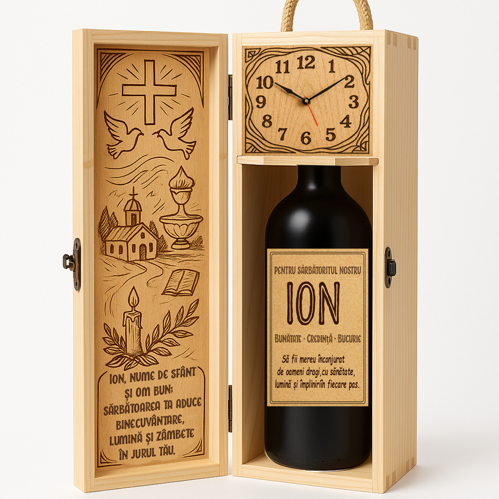 Un cadou elegant și plin de semnificație, perfect pentru a sărbători ziua celor care poartă numele Sfântului Ion. Cutia din lemn de pin, prevăzută cu mâner din sfoară și închidere metalică, impresionează prin designul său rafinat și aspectul natural – o alegere inspirată pentru a oferi un gest de prețuire și bucurie.