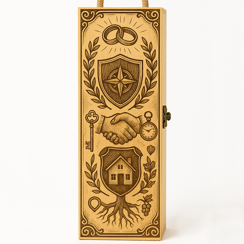 Interiorul este realizat cu atenție la detalii și include un ceas funcțional, simbol al timpului petrecut alături de familie, al înțelepciunii și al echilibrului. În interior se află o sticlă de vin roșu de 750 ml, cu etichetă personalizată, unde pot fi adăugate mesaje de mulțumire, urări sau dedicații elegante, transformând darul într-o amintire plină de semnificație.