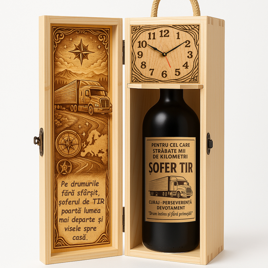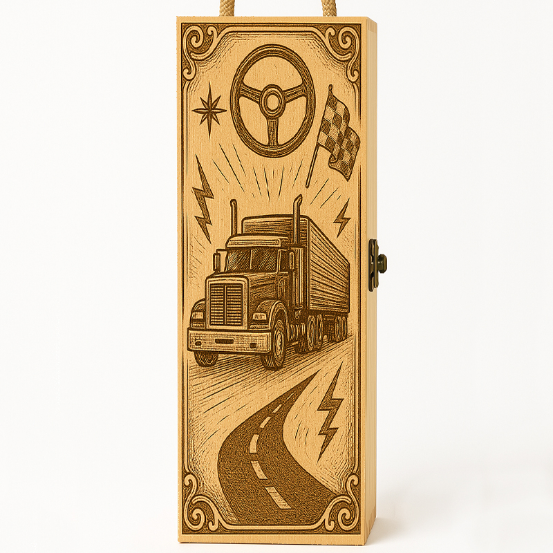 Un cadou elegant și plin de semnificație pentru un profesionist al drumurilor lungi. Cutia din lemn de pin, prevăzută cu mâner din sfoară și închidere metalică, impresionează prin simplitate nobilă și o prezentare de lux, potrivită pentru a onora responsabilitatea și rezistența din spatele fiecărei curse.
