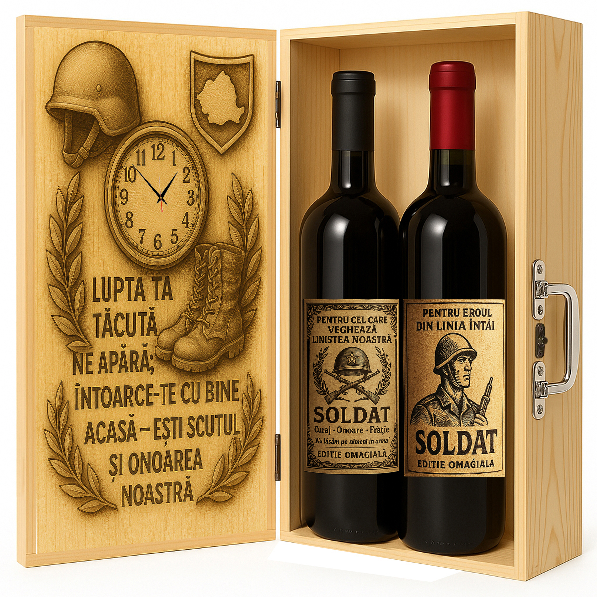 Un dar de reprezentare, potrivit pentru un soldat și pentru orice moment important din carieră sau viața personală. Cutia din lemn de pin tip cufăr, cu inserții din piele și închidere metalică, se remarcă prin finisaje atente și o prezentare de lux. Exteriorul are un design tematic discret, iar interiorul adaugă o notă ceremonială și rafinată, cu ceas funcțional integrat – simbol al disciplinei și al respectului pentru timp.