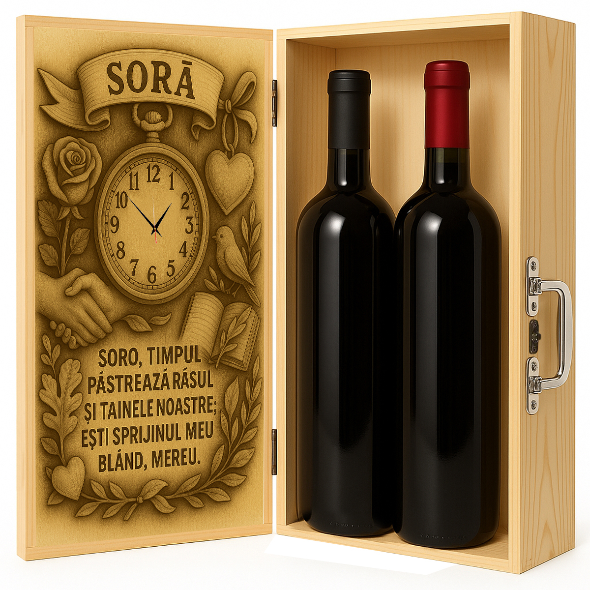 Interiorul are o notă caldă și rafinată, completată de un ceas funcțional, simbol al timpului și al amintirilor împărtășite. Setul conține două sticle de vin a 750 ml, fiecare cu etichetă personalizată, iar textele din interior pot fi adaptate pentru un mesaj plin de afecțiune, recunoștință și admirație.