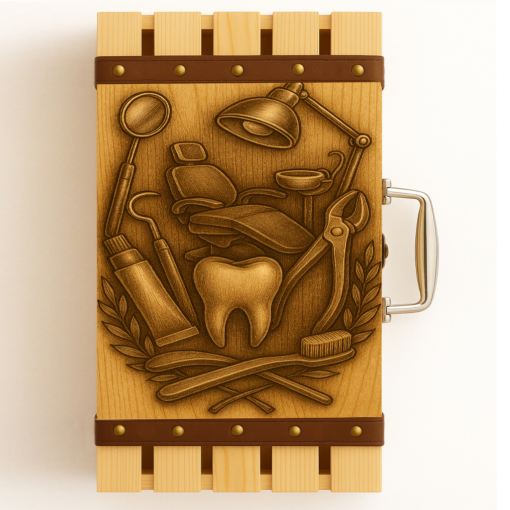 Un cadou elegant și rafinat, potrivit pentru a onora munca și dedicația unui profesionist desăvârșit. Cutia din lemn de pin tip cufăr, cu inserții din piele și închidere metalică, impresionează prin echilibrul designului și printr-o prezentare de lux, demnă de un cadou oferit unui medic stomatolog.