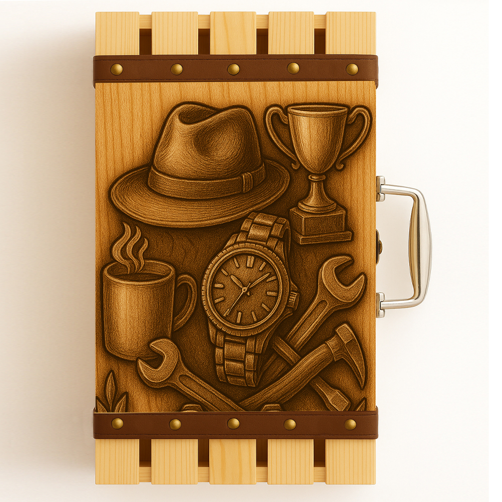 Un dar cu semnificație profundă, dedicat celui care a oferit sprijin, înțelepciune și exemplu. Cutia din lemn de pin tip cufăr, cu inserții din piele și închidere metalică, este o alegere inspirată pentru un cadou de lux oferit tatălui. Finisajele atent lucrate și linia elegantă transmit rafinament și respect, transformând momentul oferirii într-o amintire de preț.