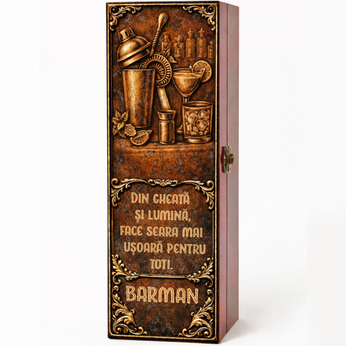 Surprinde un barman cu un cadou elegant, original și memorabil, ales special pentru cineva care transformă fiecare servire într-o experiență. Această cutie cadou cu vin personalizat este alegerea ideală atunci când vrei să oferi un dar rafinat, cu personalitate, potrivit pentru un profesionist care apreciază prezentarea impecabilă, detaliile bine alese și produsele de calitate.