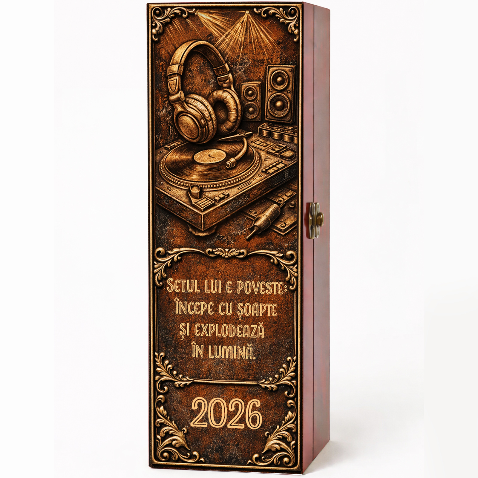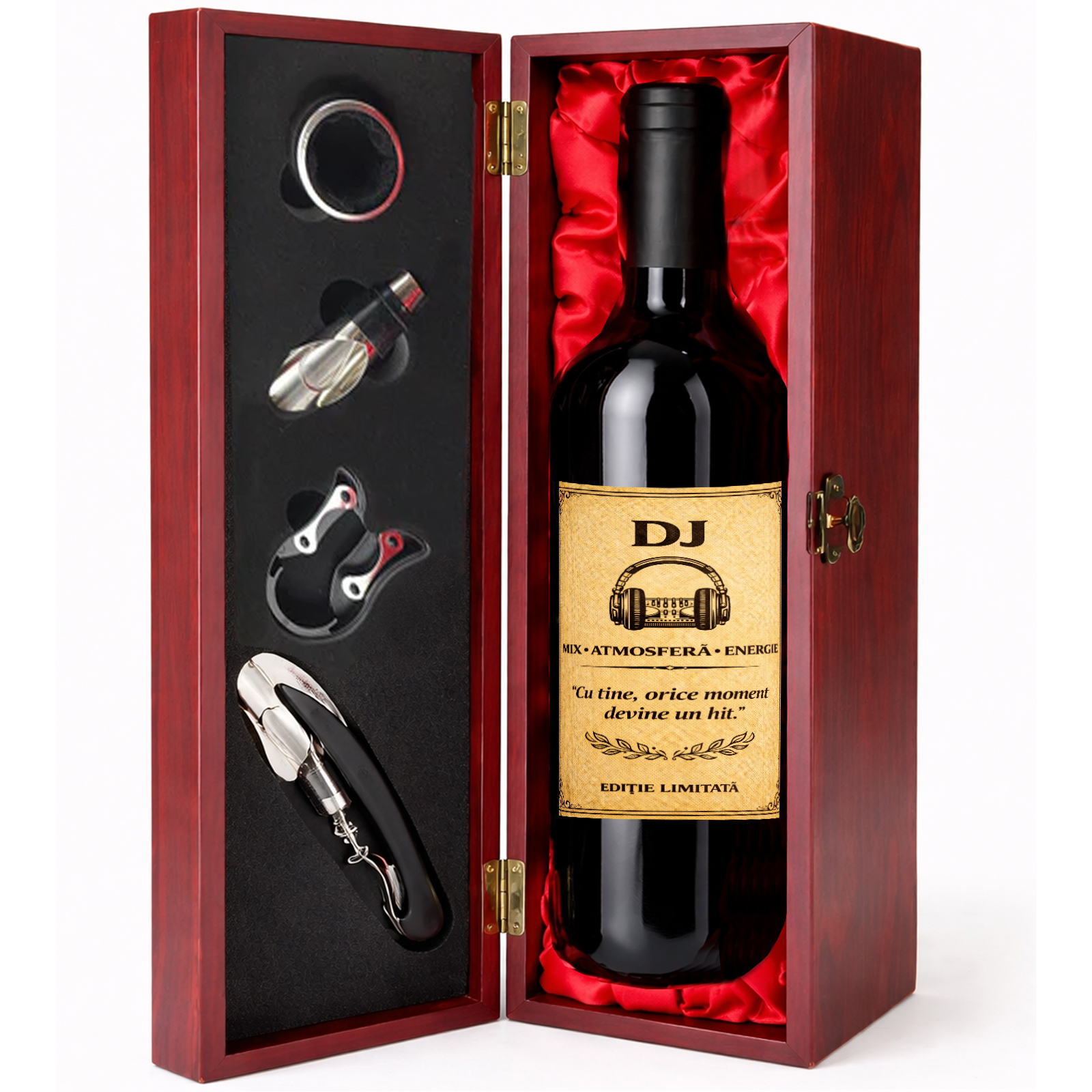 Surprinde un DJ cu un cadou original, elegant și memorabil, creat special pentru a impresiona prin stil, personalitate și prezentare premium. Această cutie cadou cu vin personalizat este alegerea ideală pentru un pasionat de muzică, petreceri și energie bună, fiind potrivită pentru momente speciale în care vrei să oferi mai mult decât un simplu dar.