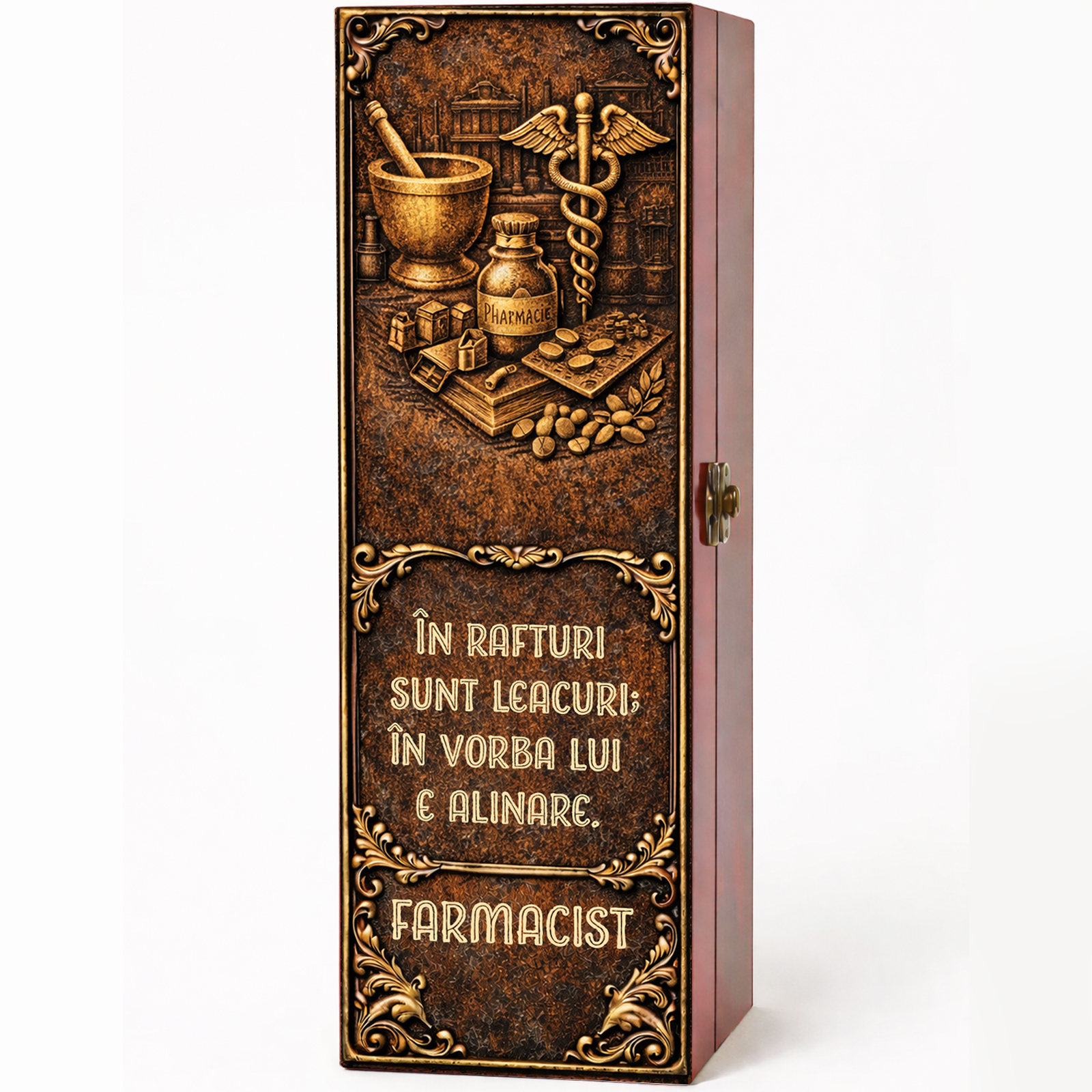 Un farmacist apreciază profesionalismul, atenția la detalii și gesturile făcute cu grijă. Acest set îmbină eleganța, utilitatea și personalizarea într-un cadou premium, potrivit pentru a transmite apreciere într-un mod rafinat și memorabil. Posibilitatea de a personaliza atât vinul, cât și cutia transformă produsul într-o alegere specială, creată pentru a celebra un om dedicat și respectat.