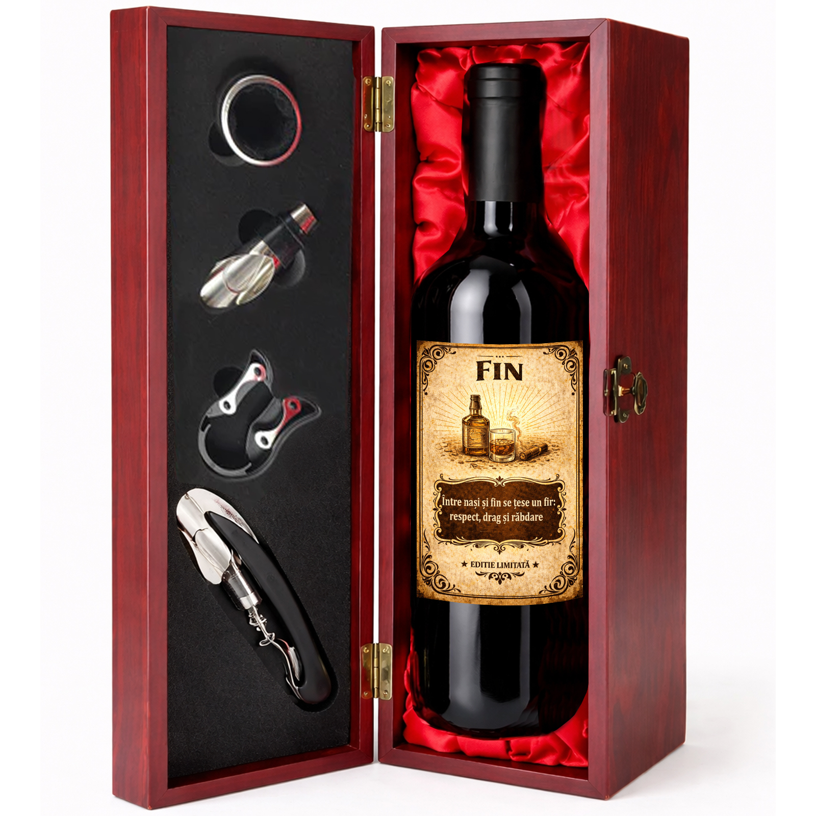 Aspect premium. Cu un design sofisticat, finisaj elegant în nuanță de mahon roșiatic și interior satinat roșu, cutia impresionează prin prezentarea sa deosebită și transformă o simplă sticlă de vin într-un cadou special. Setul include o sticlă de vin personalizat, realizată după cerințele clientului, astfel încât mesajul ales să reflecte perfect relația apropiată dintre nași și fin. Poți adăuga numele finului, o urare specială, o dedicație emoționantă sau un mesaj personalizat care să facă acest dar unic.