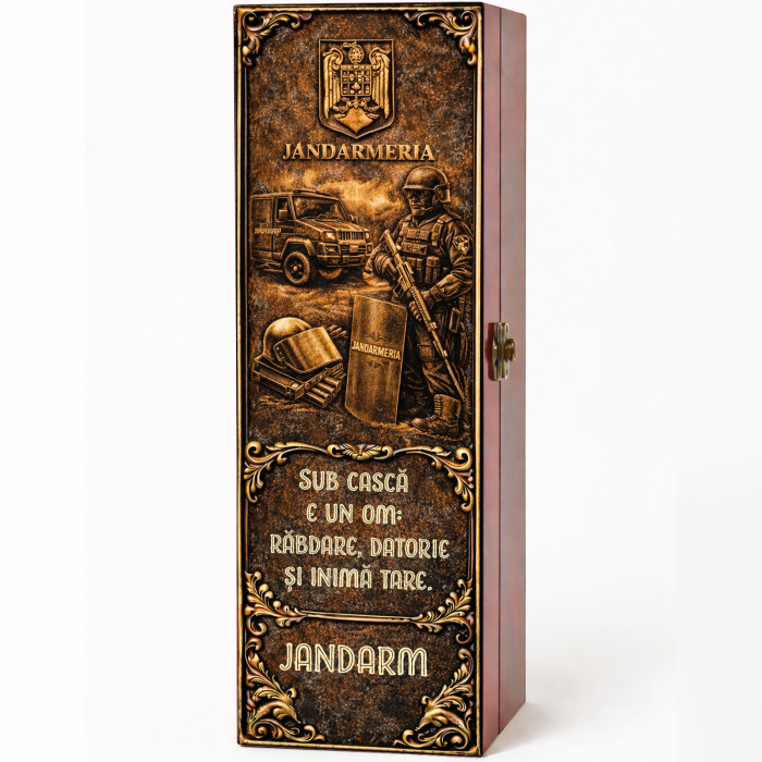Cadou memorabil. Oferă un dar elegant și deosebit unui jandarm care merită apreciere pentru curaj, disciplină și devotament. Această cutie cadou cu vin personalizat este alegerea ideală atunci când vrei să surprinzi prin rafinament, utilitate și un mesaj special, transformând un simplu cadou într-o amintire de neuitat.