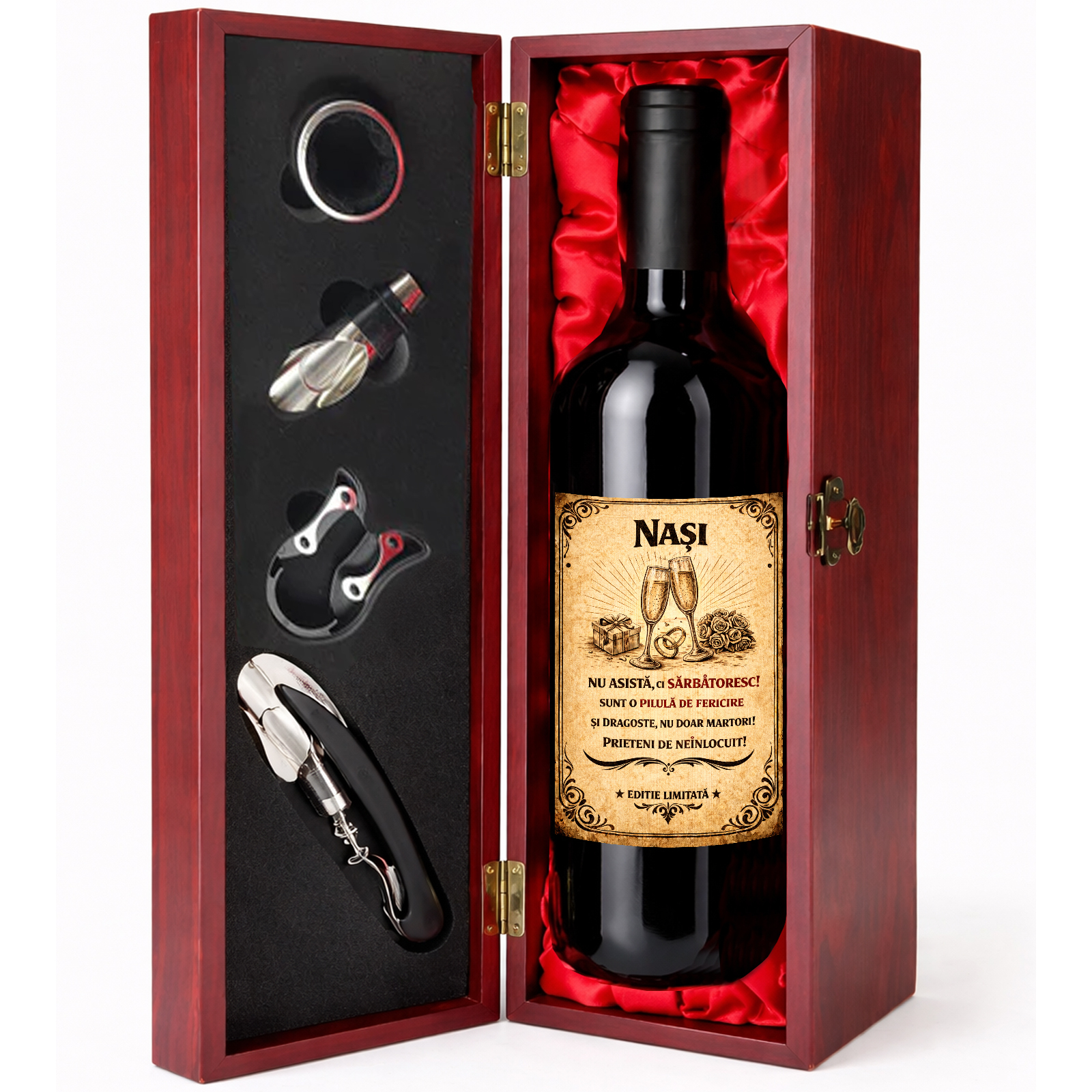Aspect premium. Cu un design sofisticat, finisaj elegant în nuanță de mahon roșiatic și interior satinat roșu, cutia impresionează prin prezentarea sa distinsă și transformă acest set într-un cadou cu adevărat special. Include o sticlă de vin personalizat, realizată după cerințele clientului, astfel încât mesajul ales să reflecte perfect legătura frumoasă dintre fini și nași. Poți adăuga nume, o dedicație emoționantă, o urare specială sau un mesaj de mulțumire care să facă darul unic și personal.