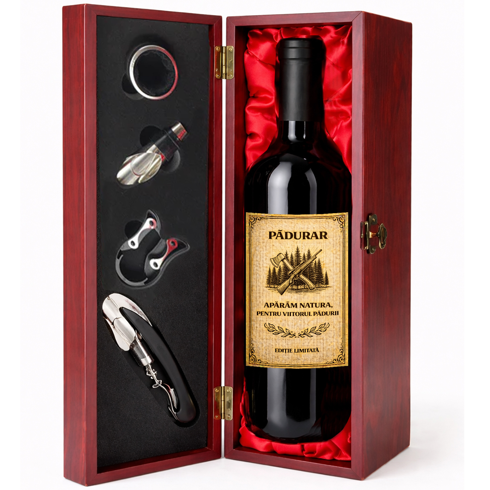 Aspect premium. Cu un design sofisticat, finisaj elegant în nuanță de mahon roșiatic și interior satinat roșu, cutia impresionează prin prezentarea sa distinsă și pune în valoare fiecare detaliu. Setul include o sticlă de vin personalizat, realizată după cerințele clientului, astfel încât mesajul ales să fie perfect adaptat destinatarului. Poți adăuga nume, funcție, o urare specială, o dedicație sau un text personalizat care să reflecte respectul pentru munca sa și dragostea pentru natură.