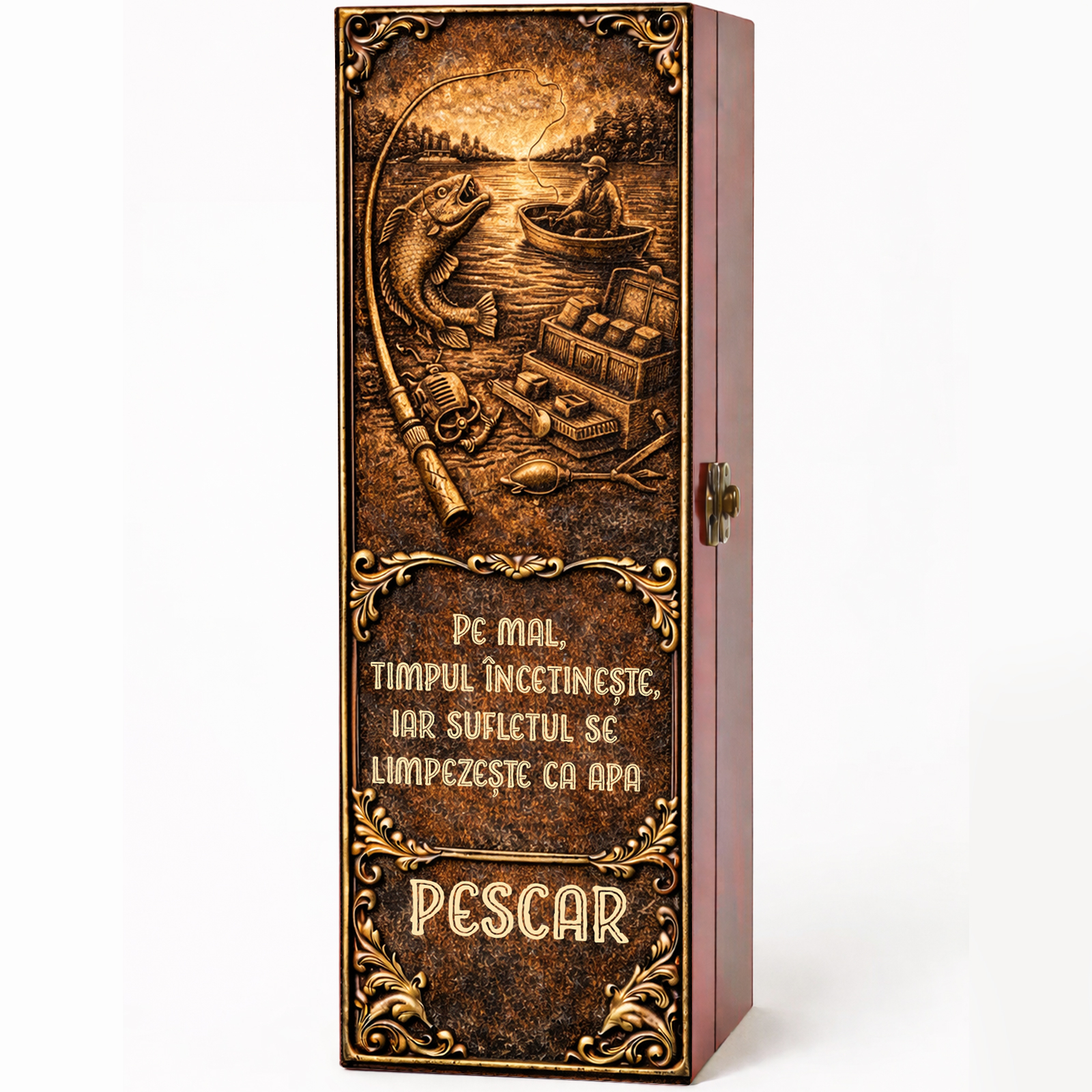 Aspect premium. Cu un design sofisticat, finisaj elegant în nuanță de mahon roșiatic și interior satinat roșu, cutia impresionează prin aspectul său distins și prin prezentarea atent realizată. Setul include o sticlă de vin personalizat, realizată după cerințele clientului, astfel încât mesajul ales să fie perfect adaptat destinatarului. Poți adăuga nume, o urare specială, o dedicație sau un text personalizat care să reflecte pasiunea pentru pescuit și bucuria momentelor petrecute în natură.