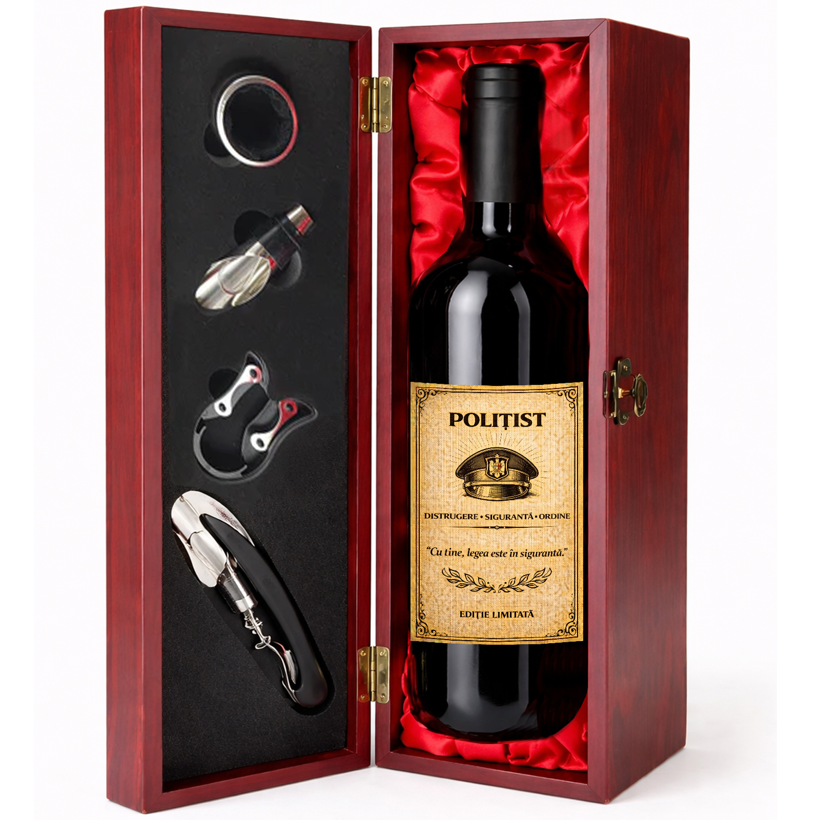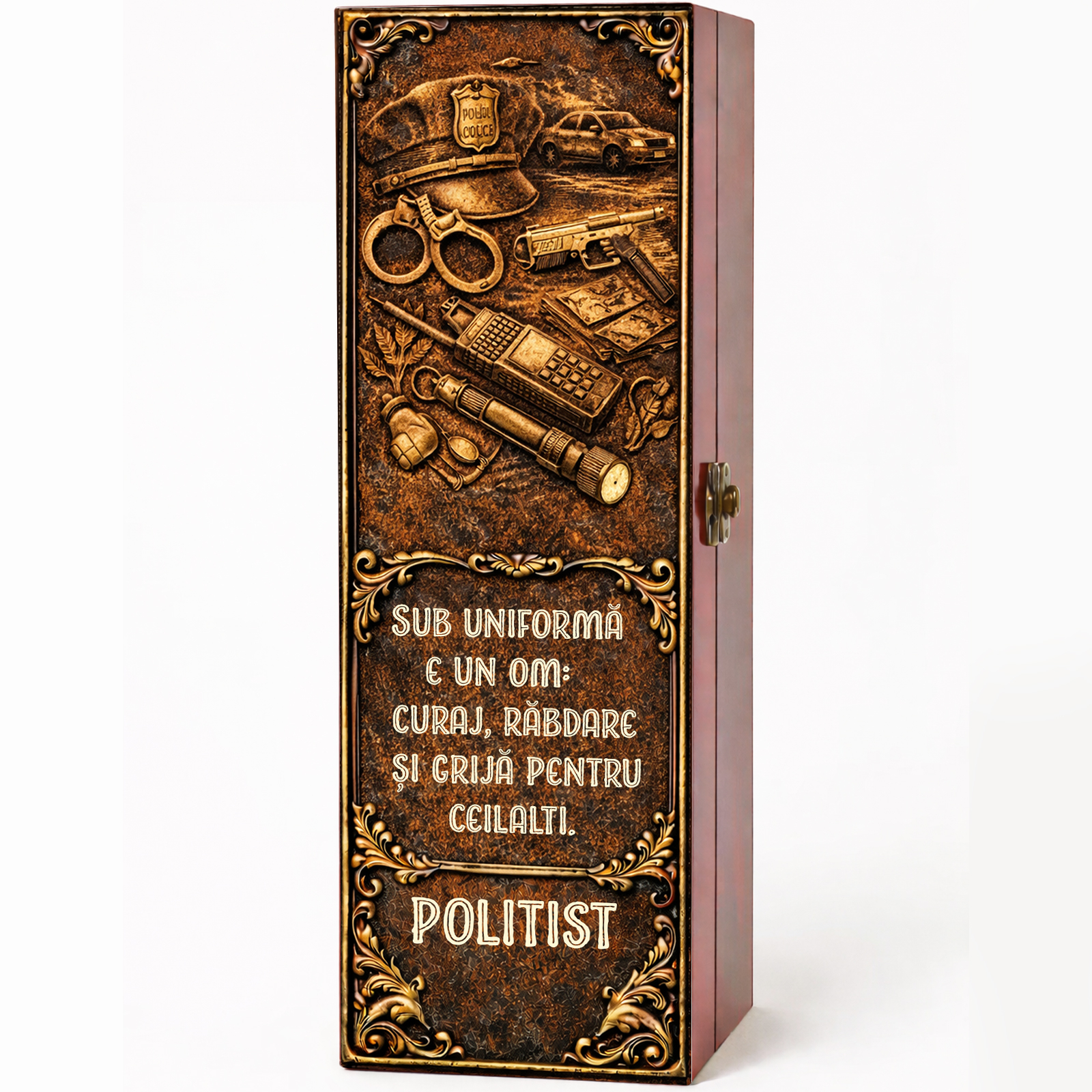 Cadou deosebit. Oferă un dar elegant și memorabil unui polițist care merită respect, apreciere și considerație pentru seriozitatea, curajul și responsabilitatea de care dă dovadă zi de zi. Această cutie cadou cu vin personalizat este alegerea ideală atunci când vrei să surprinzi prin rafinament, prezentare premium și un mesaj cu adevărat special.