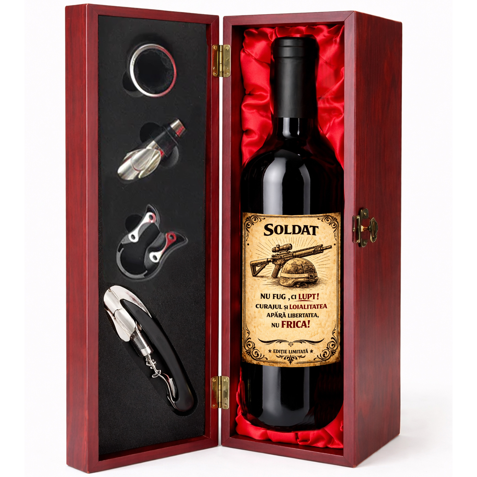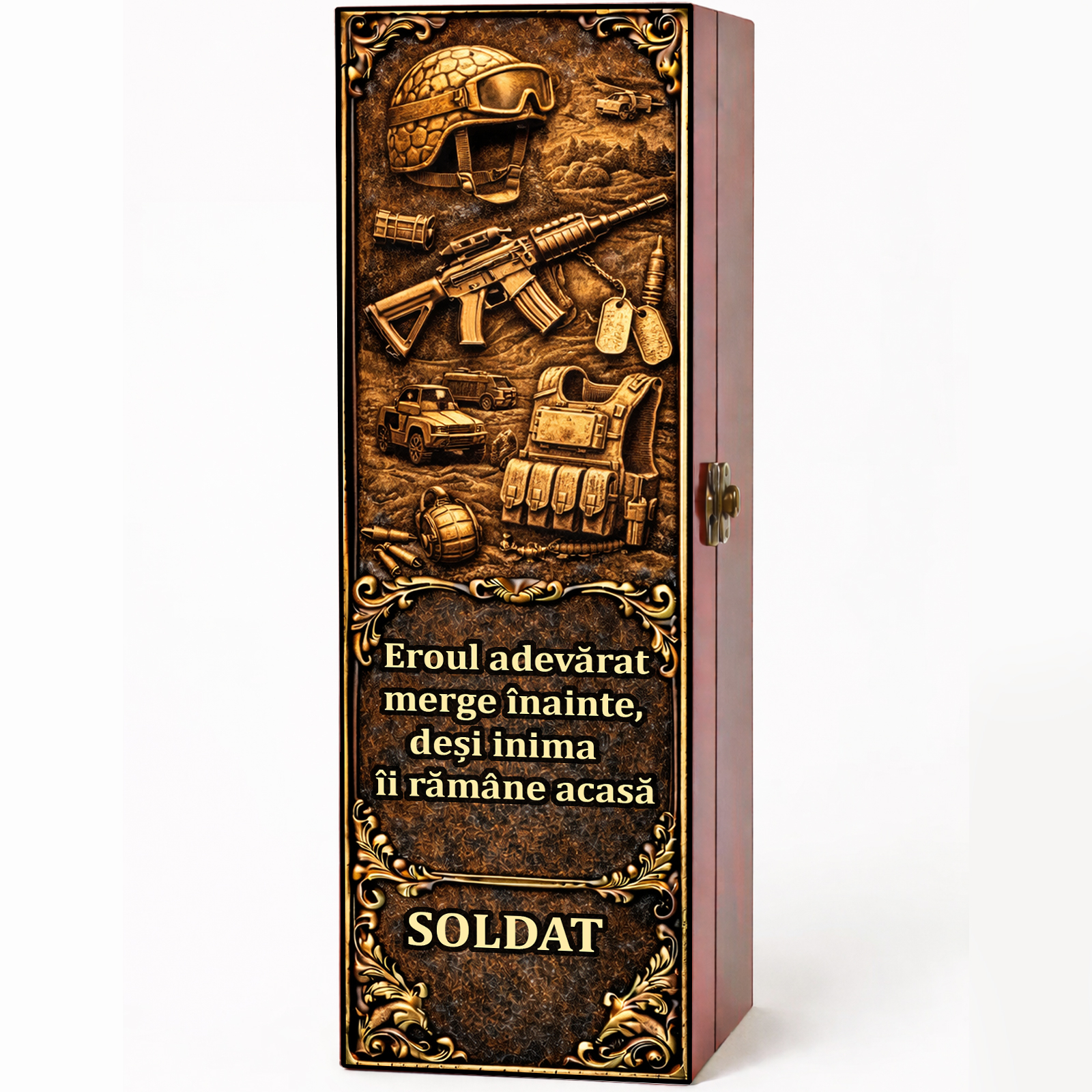 Cadou de onoare. Oferă un dar elegant și memorabil unui soldat care merită respect, apreciere și recunoștință pentru disciplină, curaj și devotament. Această cutie cadou cu vin personalizat este alegerea ideală atunci când vrei să surprinzi prin rafinament, utilitate și un mesaj special, transformând un simplu cadou într-o amintire deosebită.