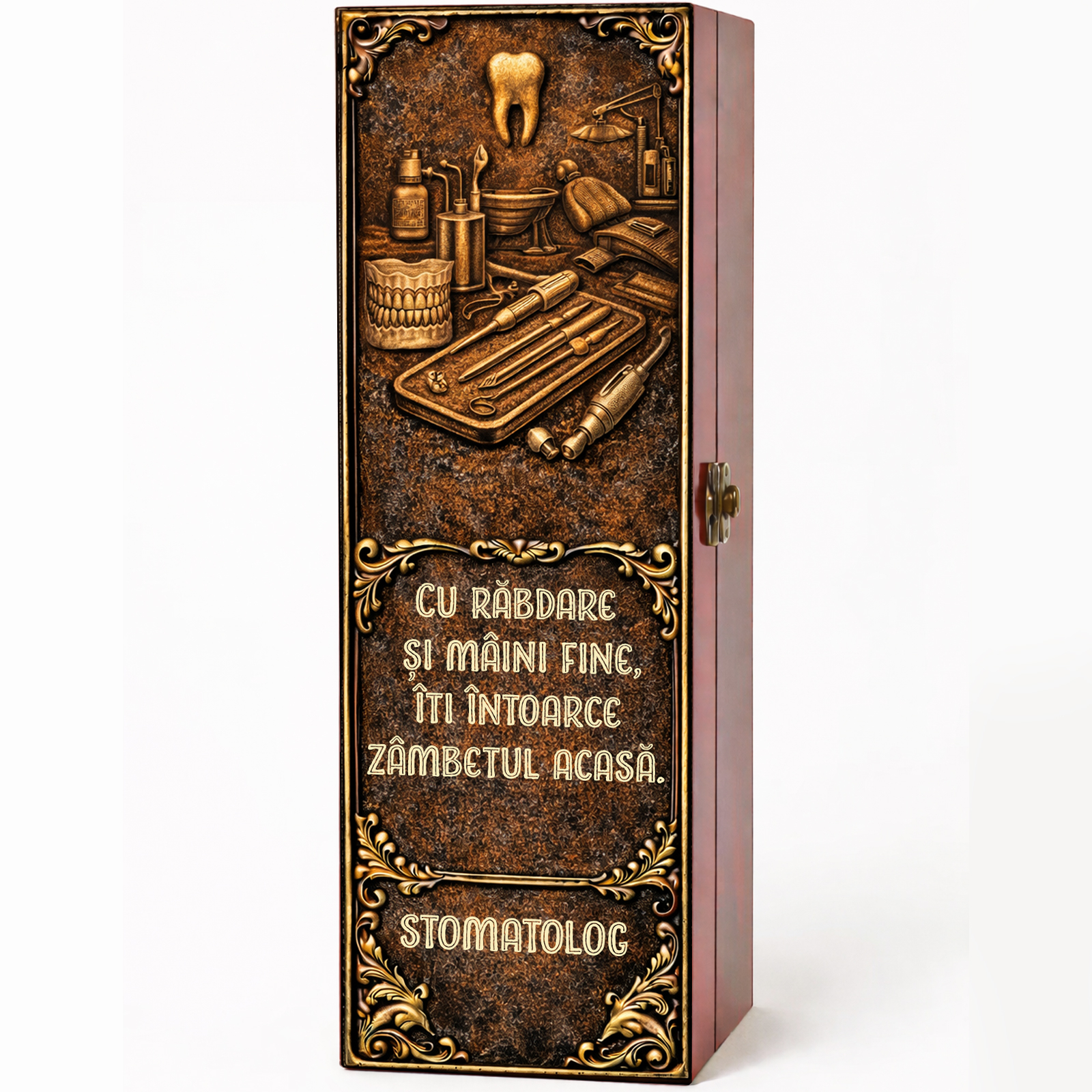 Cadou elegant. Oferă un dar rafinat și memorabil unui stomatolog care merită apreciere pentru profesionalism, răbdare și atenția acordată fiecărui detaliu. Această cutie cadou cu vin personalizat este alegerea ideală atunci când vrei să surprinzi prin bun gust, prezentare premium și un mesaj special, transformând un simplu cadou într-o amintire deosebită.