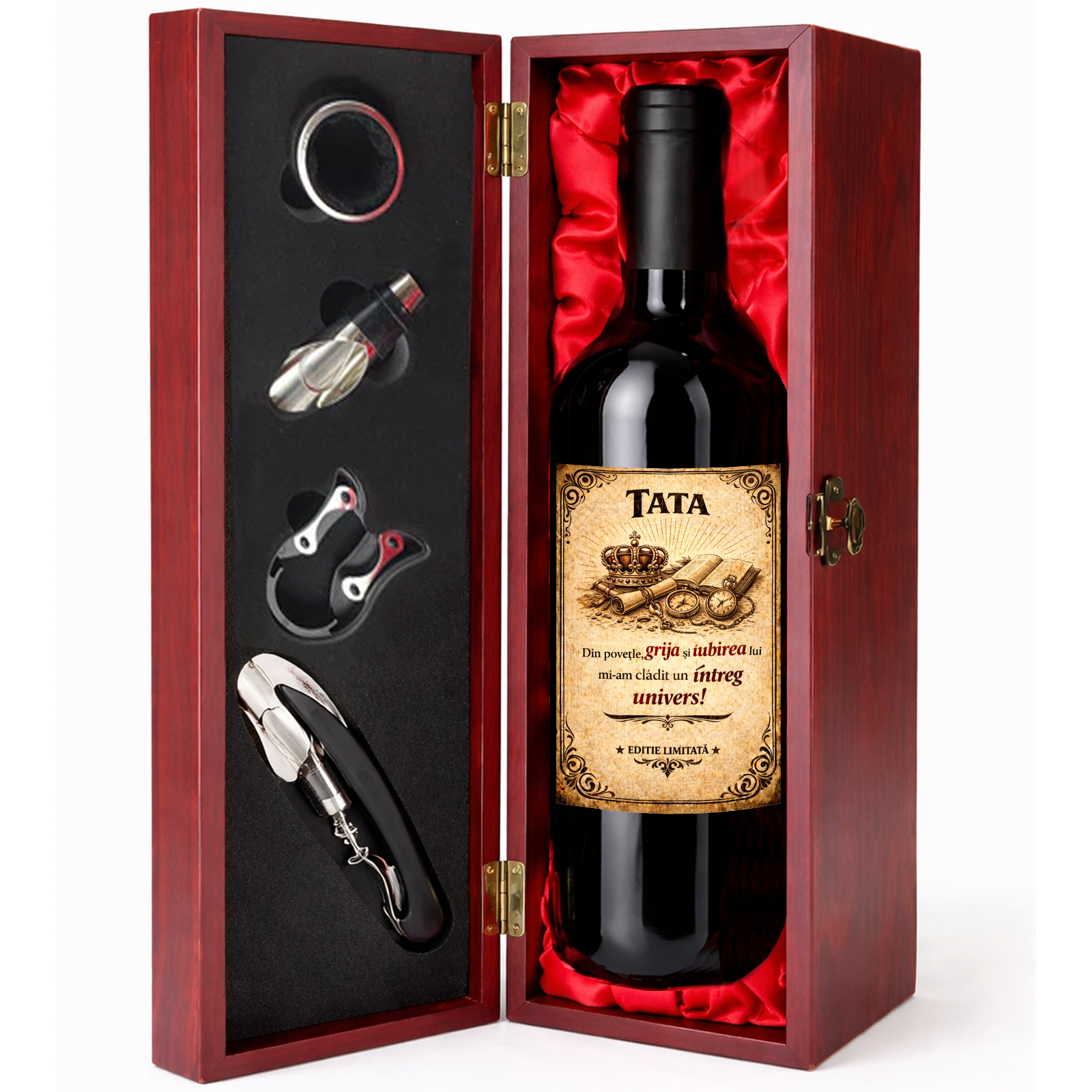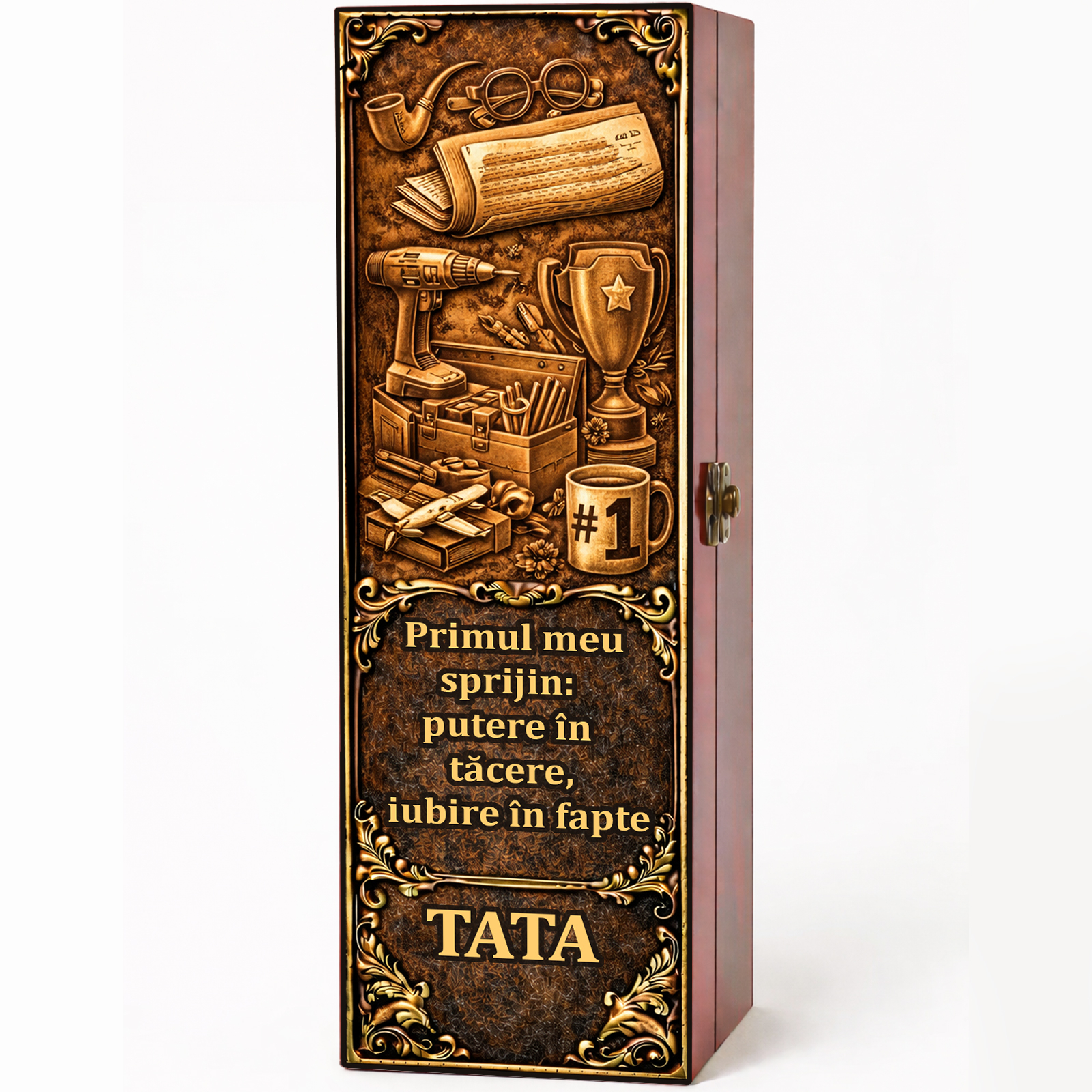 Aspect premium. Cu un design sofisticat, finisaj elegant în nuanță de mahon roșiatic și interior satinat roșu, cutia impresionează prin aspectul său distins și transformă întreaga experiență de oferire într-una specială. Setul include o sticlă de vin personalizat, realizată după cerințele clientului, astfel încât mesajul ales să reflecte perfect sentimentele transmise. Poți adăuga numele tatălui, o dedicație emoționantă, o urare specială sau un mesaj de mulțumire care să facă acest cadou unic.